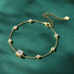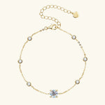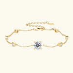 Graceful and radiant, the Elara Bracelet features a brilliant 6.5mm moissanite centerpiece accented by smaller side stones for a refined shimmer. Crafted from 925 sterling silver and finished in 14K gold plating, it embodies timeless beauty and everyday sophistication.