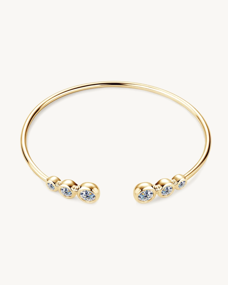 The Elara Moissanite Bangle is a masterpiece of minimalist glamour and refined shine. Designed with six dazzling Moissanite stones in graduated sizes (5mm, 4mm, and 3mm), it creates a soft, fluid sparkle that dances elegantly on the wrist.